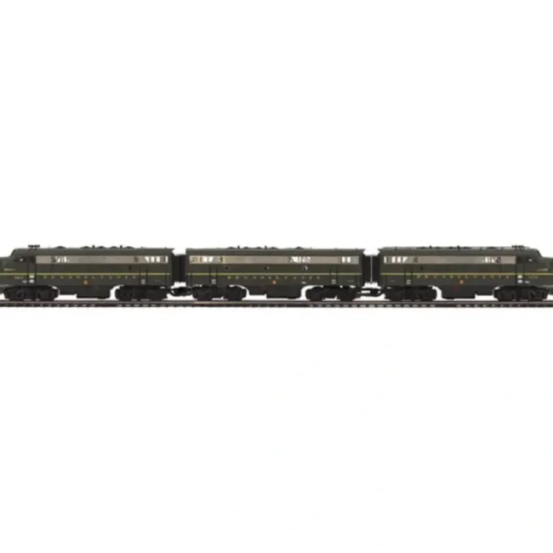 This is MTH 20-20190-2 PRR F7 A-B-A DIESEL SET. F-7 ABA diesel set w/Proto-Sound 3.0 (scale wheels), Pennsylvania. Cab numbers: A units – 9774 & 9831, B unit – 9764B. The F7 was the zenith of the covered wagon, or carbody-style diesel. With 3,849 units built between 1949 and 1953, the F7 was both the most popular carbody diesel and its last hurrah. By 1954 U.S. railroads had virtually stopped ordering F-units in favor of hood units like EMD’s GP9 and Alco’s RS-3. The side walkways of hood units offered better access for maintenance and better visibility for backup moves, making them truly universal locomotives useful for both mainline runs and road switching.