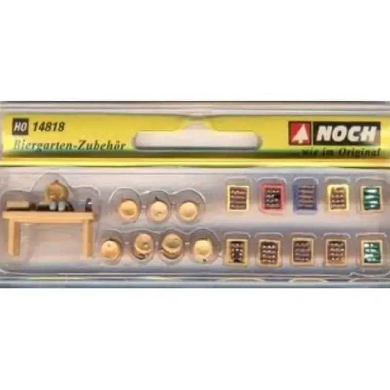 This is Noch 14818 HO Beer Garden Accessories. Includes 7 kegs, 10 beverage crates and 1 table.