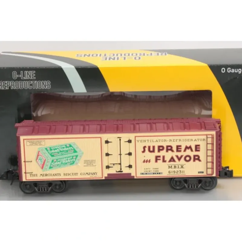 This is an O-Line 126 Merchants Biscuit Reefer #6192311. It is 10 1/4 inches long. It features die cast metal trucks, all metal operating couplers, separate metal ladders, separate metal grab rails, separate metal brakewheel, metal chassis with underside detailing and opening doors. Painted in TAN-RED-BROWN with multi-color logo and lettering in BLACK and RED. The road number is 6192311.