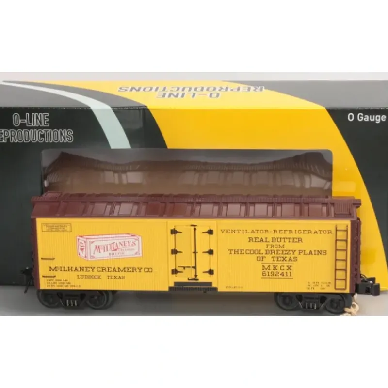 This is an O-Line 128 McLahnery Creamery Reefer #6192411. It is 10 1/4 inches long. It features die cast metal trucks, all metal operating couplers, separate metal ladders, separate metal grab rails, separate metal brakewheel, metal chassis with underside detailing and opening doors. Painted in CREAM-BROWN with multi-color logo and lettering in BLACK. The road number is 6192411.