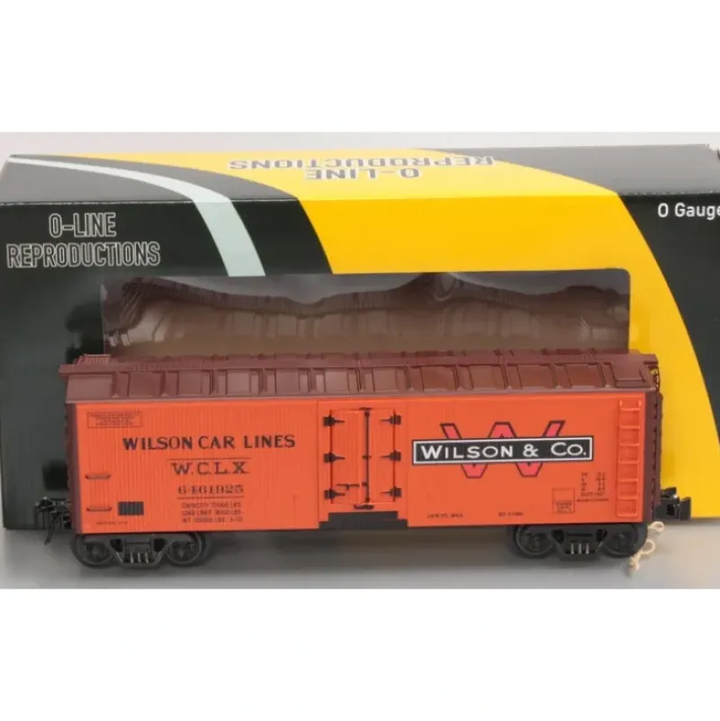 This is an O-Line 129 Wilson Reefer #6462925. It is 10 1/4 inches long. It features die cast metal trucks, all metal operating couplers, separate metal ladders, separate metal grab rails, separate metal brakewheel, metal chassis with underside detailing and opening doors. Painted in ORANGE paint scheme with multi-color and BLACK lettering. The road number is 6462925.