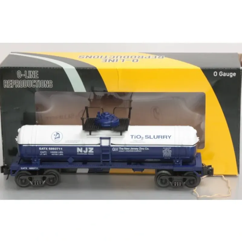This is an O-Line 164 NJ Zinc Tank Car #6893711. Cars feature all the details demanded by the most experienced train enthusiasts, including die cast trucks and wheels, operating metal couplers, needle-point axles and prototypical paint schemes to offer the best value in O-27 Scale freight cars. Painted in the authentic WHITE/BLUE paint scheme with WHITE/BLUE lettering and name/logo. The road number is 6893711.