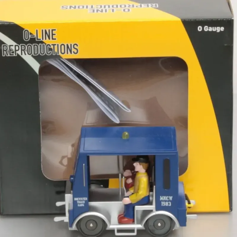 This is an O-Line 407 Metro North Speeder. It is a 3-rail 0/0-27 gauge Flashing Roof Beacon Operating Front Headlight Metal Wheels 2 Seated Figures ON-OFF Switch 2 Pickup Rollers for Improved Center Rail Electrical Contact 3 Position Reversing Unit F-N-R Crisp Painting and Lettering.