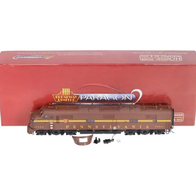 This is a Broadway Limited 2731 HO PRR EMD E7A w/Paragon2 Sound/DC/DCC #5864A (Single Stripe, Tuscan, Yellow).Industry Leading Features:All New Paragon2 Sound and control system,Integral DC/DCC dual mode decoder for ease of operation on any layout,Industry best slow speed operation in DC and DCC,Prototypical light operation with headlight, cab light, rear light and Mars light (where applicable),Authentic EMD E-Unit Sounds – Controllable in DC and DCC,All-wheel drive and All-wheel electrical pick-up,2 Operating knuckle couplers,Factory installed engineer and fireman figures. Product Specifications: ABS plastic body with heavy die cast chassis for maximum tractive force,Precision gearing optimized for smooth operation,5-pole can motor with skew wound armature and dual fly wheels,Separately applied handrails, ladders, horns, bell, and more,Will operate on code 70, 83 and 100 rail,Recommended minimum radius: 18 inches.