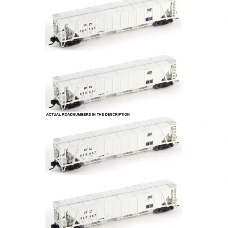 This is a Broadway Limited 3174 N Scale Penn Central PRR Class H32 5-Bay Covered Hopper 4-Pack – Ready to Run Set A (gray, black).Industry-Leading Features: Beautifully Detailed and Accurately Modeled, Precision Paint, Color, and Lettering Schemes, Many Separately Applied Details, Composition: ABS, Couplers: (2) Operating MicroTrains #1015 or Compatible, Compatible Tracks: Code 55, 70, 83, & 100 Rail, Minimum Operating Radius: 9.75 in.