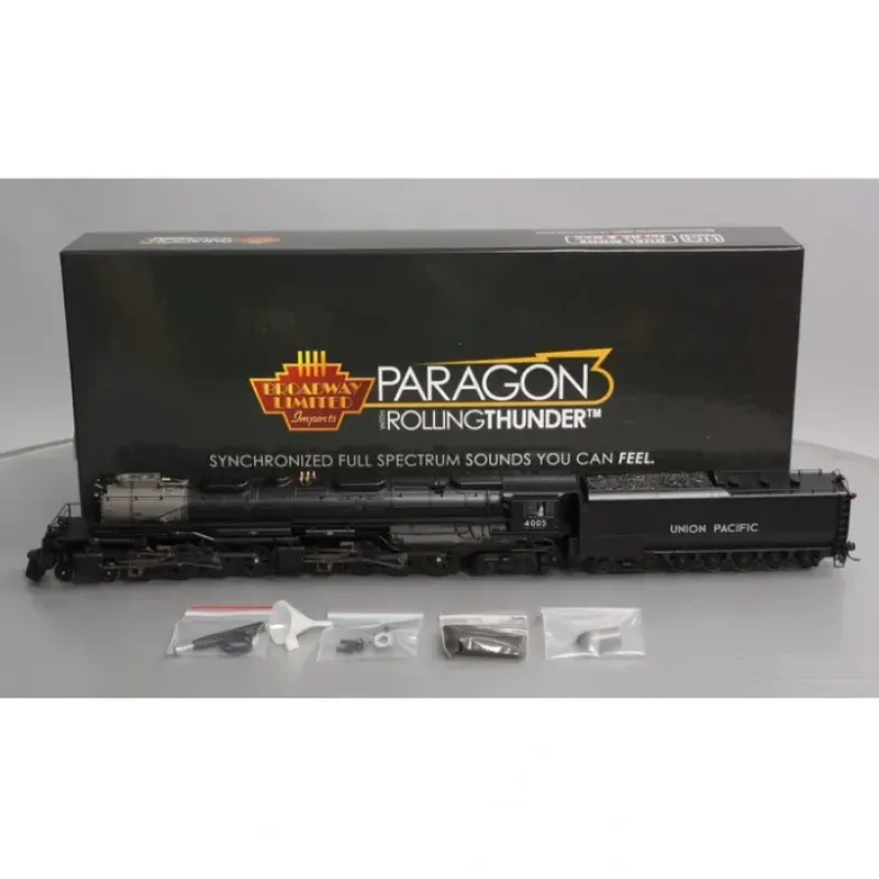 This is a Broadway Limited 4386 HO Scale Union Pacific 4-8-8-4 Big Boy 25-C-400 Coal Tender with Sound& DCC – Paragon3 #4005 (Denver Museum Version, black, graphite, Wilson Aftercoo. Features: New Paragon3 Sound & Operation System Featuring Rolling Thunder with Authentic Sounds and Prototypical Operation in both DC and DCC environments, Factory Installed Engineer / Fireman Figures, Synchronized Puffing Smoke with each Chuff, Variable Puffing Smoke Intensity and Timing, Lighted Number Boards, Lighted Marker Lights, Locomotive Composition: Die Cast Body with Die Cast Chassis, Tender Composition: Die Cast Body with Die Cast Chassis, Couplers: (2) Operating Kadee or Compatible, Compatible Tracks: Code 70, 83, 100 Rail, Equipped with Traction Tires, Minimum Operating Radius: 18 in or greater.