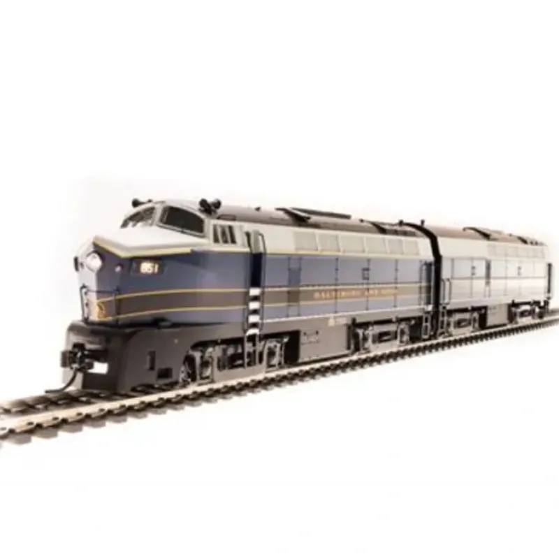 This is a Broadway Limited P125 HO Scale Baltimore & Ohio Baldwin RF16 Shark A-B Set with Sound& DCC – Paragon2 #853A, 853X (blue, gray, black).Industry-Leading Features (of Sound-equipped models): All New Paragon2 Sound and control system for DC & DCC,Integral DC/DCC dual mode decoder for ease of operation,Industry best slow-speed operation in DC and DCC,Functions are accessible in DC using the DCMaster,Prototypical light operation with headlight,Authentic Baldwin Shark Sounds! Controllable in DC and DCC.,All-wheel drive and All-wheel electrical pick-up,Factory instAlled engineer and fireman figures,Near brass-caliber detail at a plastic price. Product Information: ABS plastic body with heavy die cast chassis for maximum tractive effort,5-pole can motor with skew wound armature,A-unit length (coupler to coupler): 8 inches,B-unit length (coupler to coupler): 7.7 inches,Locomotive Weight: Unavailable at this time,Many separately applied details such as handrails, ladders, horn, and brass bell,Operating knuckle couplers,Will Operate on Code 70, 83, and 100 rail,Recommended Minimum Radius: 18 inches.