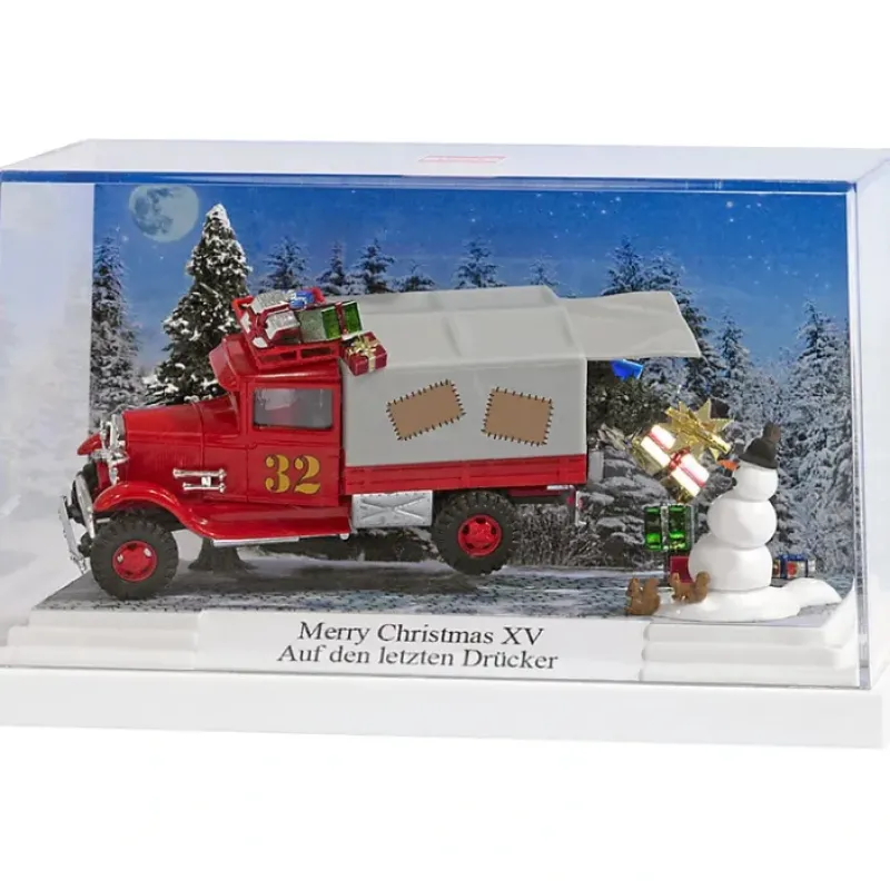 This is Busch 7642 Scene Merry Xmas XV. Miniature scene. At the last minute. Santa Claus is running behind schedule and is speeding around a corner with his delivery truck No. 32 and, in so doing, is losing some of his packages. Hopefully he will notice his mistake. These collectible miniature scenes look great on your layout or on display. Fully assembled with scenery materials and figures, most also include a vehicle and accessories. For safe, dust-free display, each comes in a clear plastic box with case.