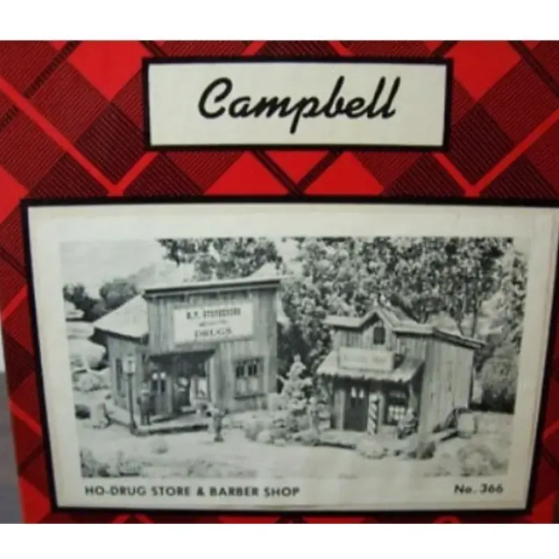 This is a Campbell 366 HO W T Stephenson Drug Company & Barber Shop. These craftsman kit consists of scale lumber (sugar pine), realistic roof shingles, printed card stock, all signage, and inject-molded plastic windows. All material is ready to be painted and weatherized. Complete instructions are included.