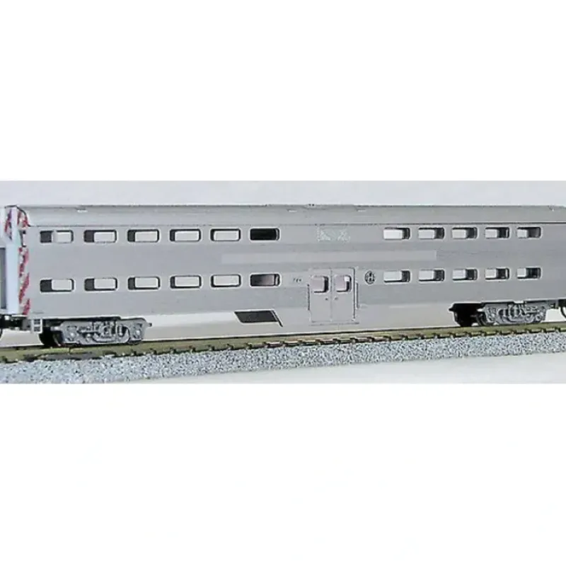 This is a Con-Cor 0001-40572-2 N Scale Pullman-Standard Corrugated Side Bi-Level Commuter Cab Burlington Northern Santa Fe Ready-to-run passenger cars feature painted and lettered injection-molded plastic bodies, metal weights and trucks with metal wheelsets. Cab cars feature end-of-car operator’s cab windows and details.