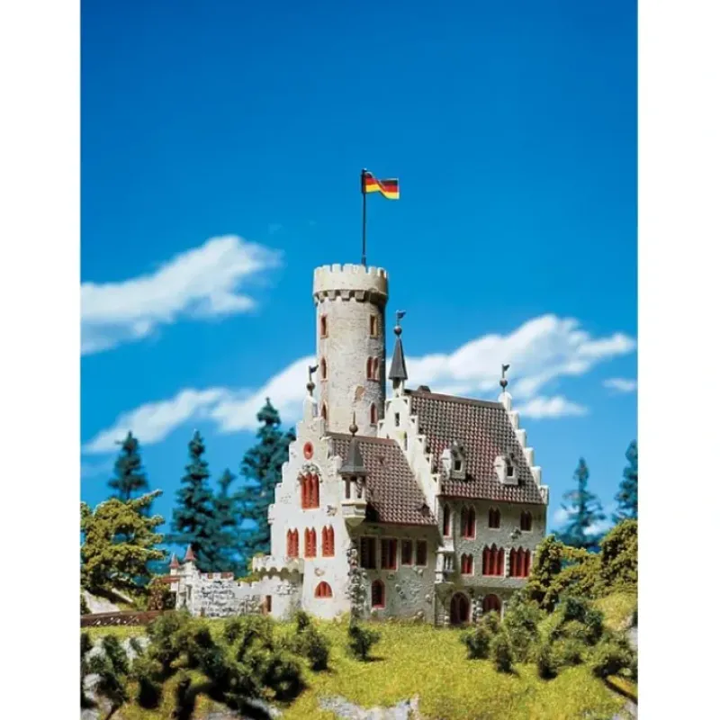 This is Faller 232242 Moated castle. Castle with moat. The base of this romantic castle contains a moat surrounding the entire complex; the moat can be filled with water. The ground area of the moat is 25.5cm x 13cm. This building kit contains: 90 single parts in 5 colours, window parts, 1 paper mask and 1 construction instruction.