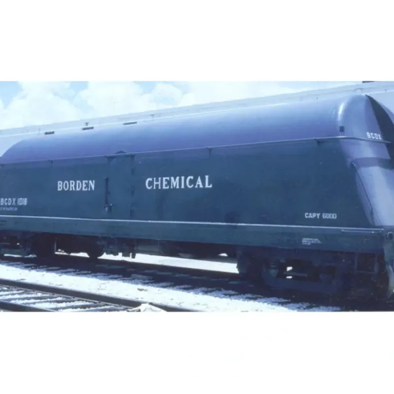 This is Funaro & Camerlengo 1014 Borden Chem tank white. Butterdish milk tank car. Resin kit. Borden’s chemical division (white) with decals and trucks, less wheels and couplers. Kit must be painted. Borden’s introduced the Milk Tank Car in the New York metropolitan area in 1926. The Internal tank cars were a vast improvement over can carrying cars. Milk was transported from farms to creameries where it was checked for purity and then pre-cooled in large bulk tanks to 36 degrees, It was then transferred to the insulated rail cars and made the trip to the city plants. In late 1935, Borden’s created the streamline milk car which looks much like a butterdish, thus the name. At first, cars were left in the natural aluminum color or painted silver. Later colors included red, white and silver. Later cars were transferred to the chemical division and used to haul Elmer’s Glue and related products, into the early 1970’s. The kit is for serious modelers only. It comes without trucks or couplers. The model is made of special, tough resin castings that are made in hand filled molds. The material is quite flexible, unlike the hard plastic of most models. If you have only done simple snap together kits, this may not be for you.