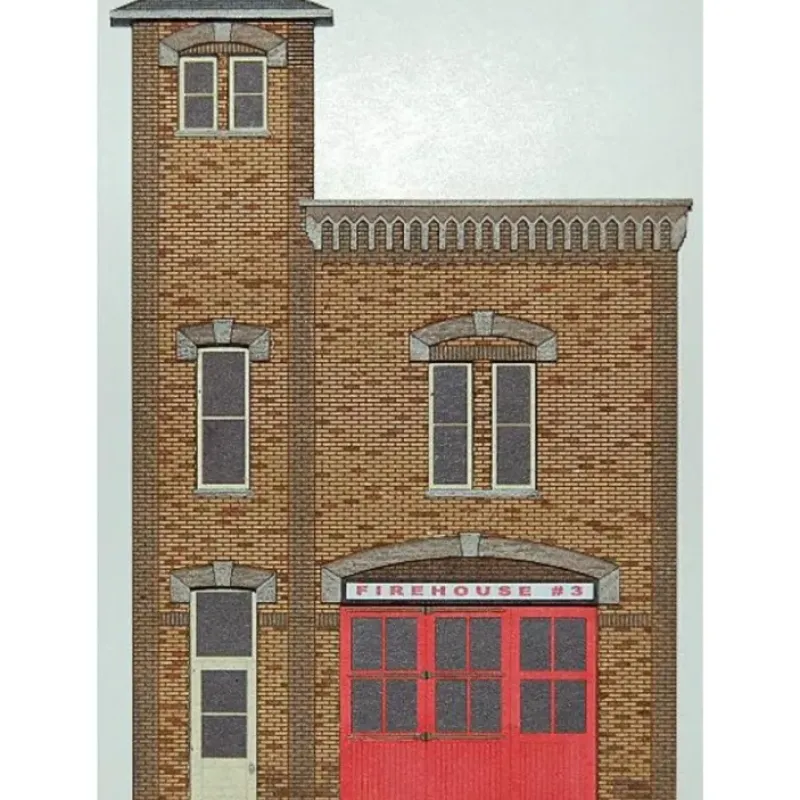 This is a GCLaser 292-19024 HO Scale Firehouse #3 Backdrop Kit – 4 x 1/4 x 5-7/8 10.2 x 1.9 x 14.9c Features laser-cut 1/8 MDF construction with laser-etched brick face plus dimensionally accurate trim, doors and windows with acetate glazing, detailed corbels and cap, stone keystones and foundation, truck door details and signage.