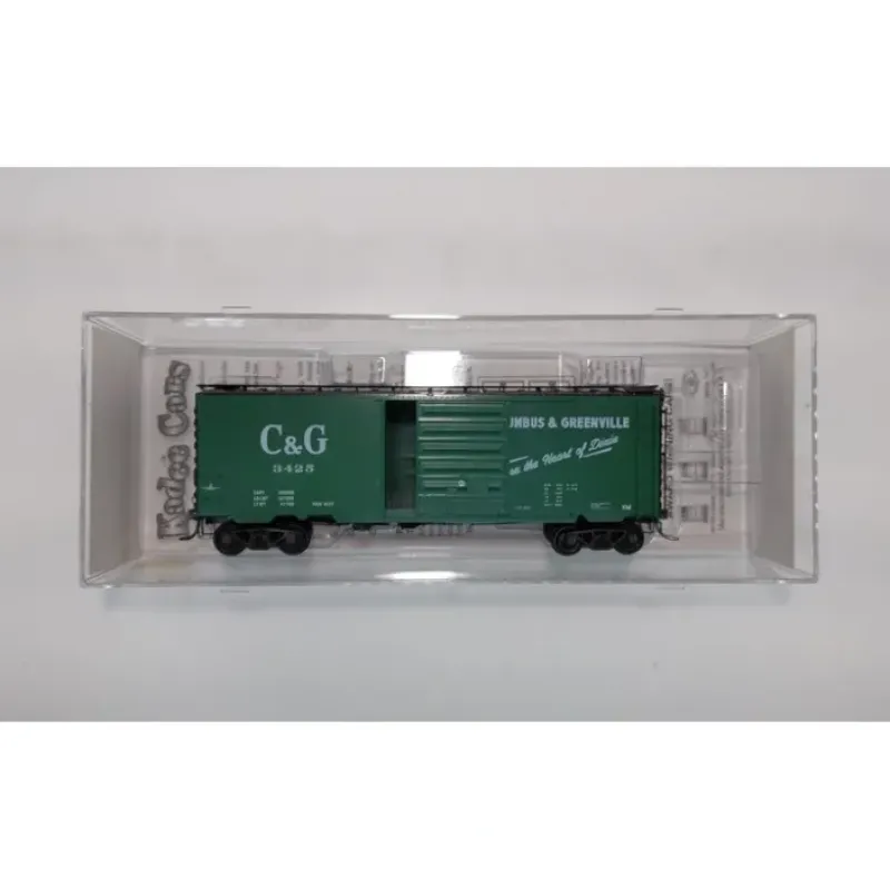 This is a Kadee 5313 HO Scale PS-1 40′ Boxcar with 8′ Pullman-Standard Door – Ready to Run Columbus & Greenville #3425 (1957 Scheme, green, black, Heart fo Dixie Sloga). One of the most popular box cars on America’s rails, thousands were built in the 1950s as railroads began replacing worn-out older equipment. The rugged all-steel construction insured a long service life well into the 1980s. These superbly detailed HO Scale models come fully assembled, ready for service. Each includes a one-piece, injection molded body mounted on a metal floor. Separate details are already installed and include: see-through roofwalk, sliding doors (correct style for the prototype car), latches, grab irons, ladders and brake gear. Each rides on Kadee(R) trucks with patented self-centering action for ease of placement on the tracks. Scale draft gear boxes include delayed centering action Magne-Matic(R) metal couplers. Models feature a riveted roof.