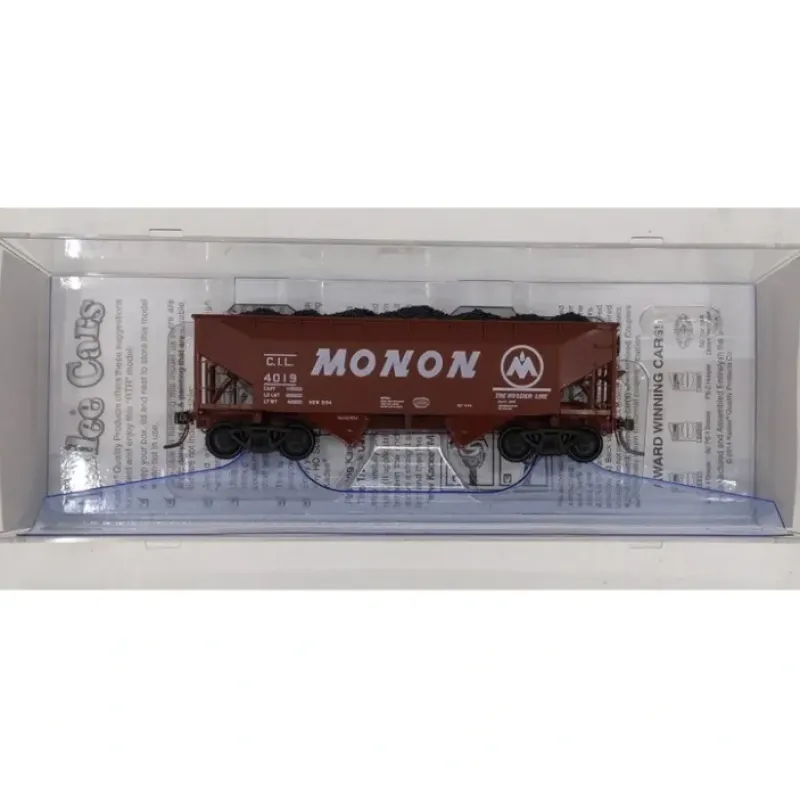 This is a Kadee 7057 HO Scale 50-Ton AAR Standard Offset 2-Bay Open Hopper with Coal Load – Ready to Run Monon CIL #4019 (1954 Boxcar Red, Billboard Monon Lettering & Logo). This car features plastic trucks, operating knuckle couplers, plastic wheels and axles.