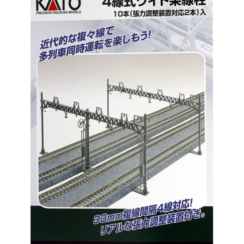 This is a Kato 23-064 N Scale Four-Track Catenary Poles (Pack of 10). This item is perfect for reproducing a railroad yard near large cities. Includes bases for ground level use and wire tensioner details.
