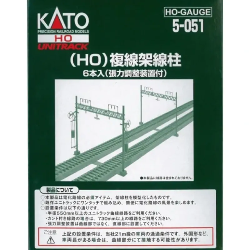 This is Kato 5-051 HO DBL WIDE CATENARY POLE. Double wide catenary poles, 6 per package.Reproduce the real pole gate shape, consisting of steel beams and concrete columns. Molded in silver for the effect of real concrete and galvanized steel beam. Double spacing (HO) unitrack track standard 60mm, suitable for quadruple track.