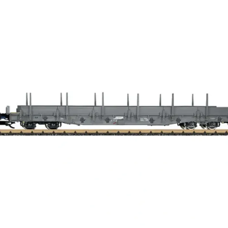This is a LGB 45922 G Scale Type Re-w 4-Axle Stake Flatcar – Ready to Run Rhaetian Railroad RhB (Era VI, gray). RhB type Re-W 4-axle stake car with aluminum hinged side walls and stakes, can be used in different eras. This kind of car was purchased in large numbers and serves chiefly to transport wood. The car has a prototypical paint scheme and lettering. The side walls can be folded down. It also has metal wheels.