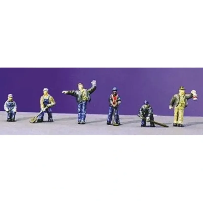 Its key features are: Railroad figures are hand painted and have natural poses Molded facial details, sturdy material Three men are in acts of labor, two men stand with their arms raised, and one man sits Clothing of men includes blue overalls, pants, heavy shirts, and hats Working men all add great authenticity to track layout or any HO scale model