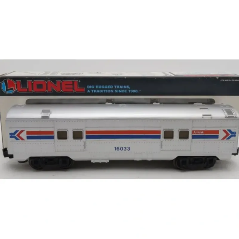 Here is the Lionel 6-16033 O Gauge Amtrak Streamlined Baggage Car. Features include plastic construction, interior lighting, plastic trucks, knuckle couplers, and it is 11 inches long.