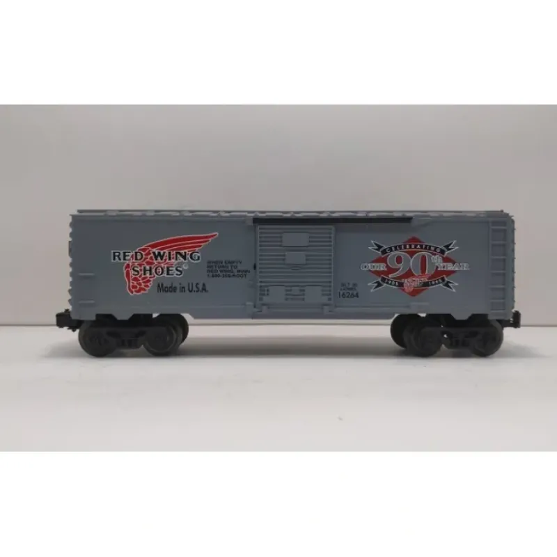 Here is a Lionel 6-16264 O Gauge Red Wing Shoes Boxcar #16264. This car features a durable plastic construction with sliding doors, plastic trucks, metal wheels and axles, operating knuckle couplers, and attractive decoration.