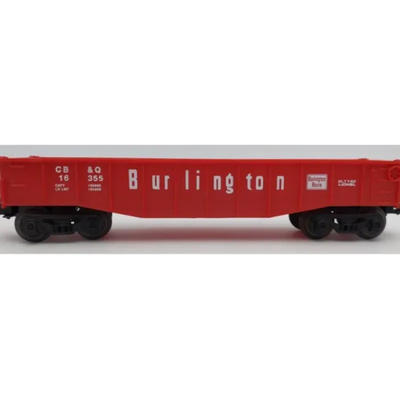 This is aLionel 6-16355 O Gauge Burlington Gondola w/ Containers from 1992-95. This gondola features plastic trucks, operating knuckle couplers, metal wheels and axles, and removable canisters. It measures approximately 9 1/2″ long.