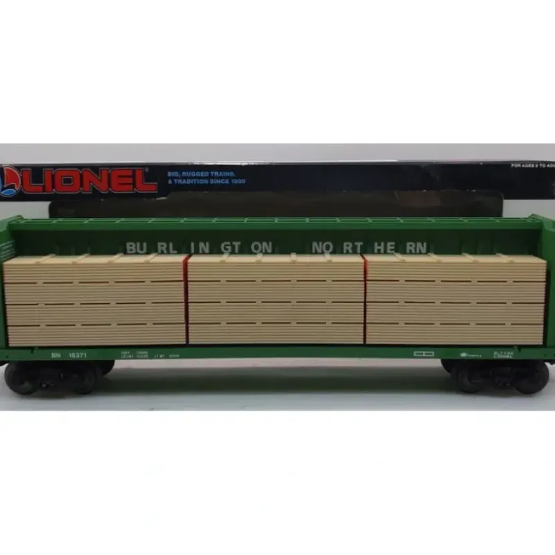 Here is a Lionel 6-16371 O Gauge Burlington Northern I-Beam Flat Car w/ Wood Load #16371. It features die cast sprung trucks and operating couplers.