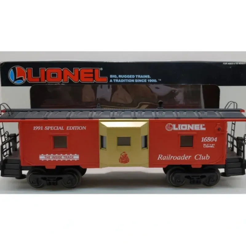 Here is a Lionel 6-16804 O Gauge Lionel Railroader Club Bay Window Caboose. This car is part of a series of cars specially available to members of the Lionel Collectors Club. It is lighted and also features plastic trucks and operating couplers.