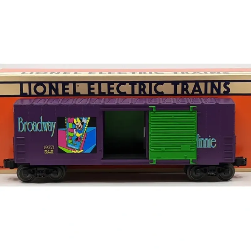 This is a Lionel 19271 Disney Broadway Minnie Mouse Hi-Cube Boxcar from 1995. This boxcar features sliding doors, die-cast metal sprung trucks, die-cast metal operating knuckle couplers, metal wheels and axles.
