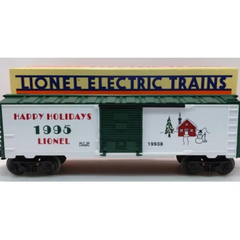 Here is a Lionel 6-19938 O Gauge Lionel Christmas Boxcar #1995. This boxcar features sliding doors, plastic trucks, operating knuckle couplers, metal wheels and axles.