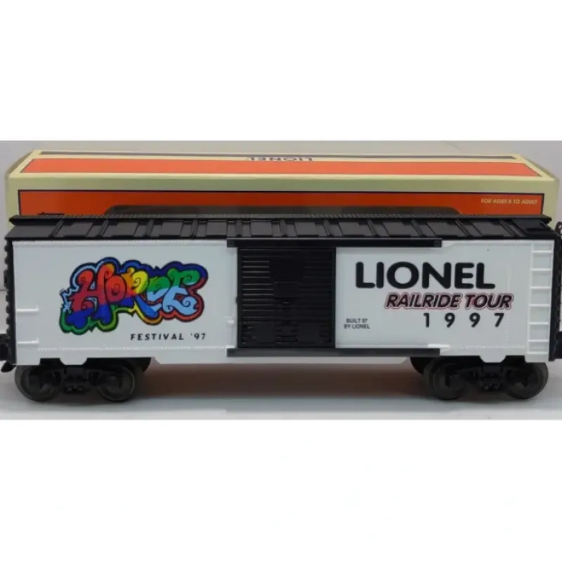 This is the Lionel 6-29225 O Gauge H.O.R.D.E. Music Festival Boxcar #1997. Neil Young is part owner of Lionel and headlined all thirty dates of the H.O.R.D.E. tour in 1997, despite appearing only once on the 1996. The 1997 tour was the 6th and most sucessful year of the 3-week tour which travelled through Europe instead of the US that year. This car commerorates Neil’s great success with H.O.R.D.E. that year. The H.O.R.D.E. Festival (also known as the H.O.R.D.E. Tour) was a rock festival originated by the musical group Blues Traveler in 1992. It was inspired from the success of the Lollapalooza festival. The H.O.R.D.E. Festival was discontinued in 1999. H.O.R.D.E is an acronym that stands for Horizons of Rock Developing Everywhere. This car features sliding doors, die-cast metal sprung trucks, die-cast metal operating knuckle couplers and metal wheels and axles.