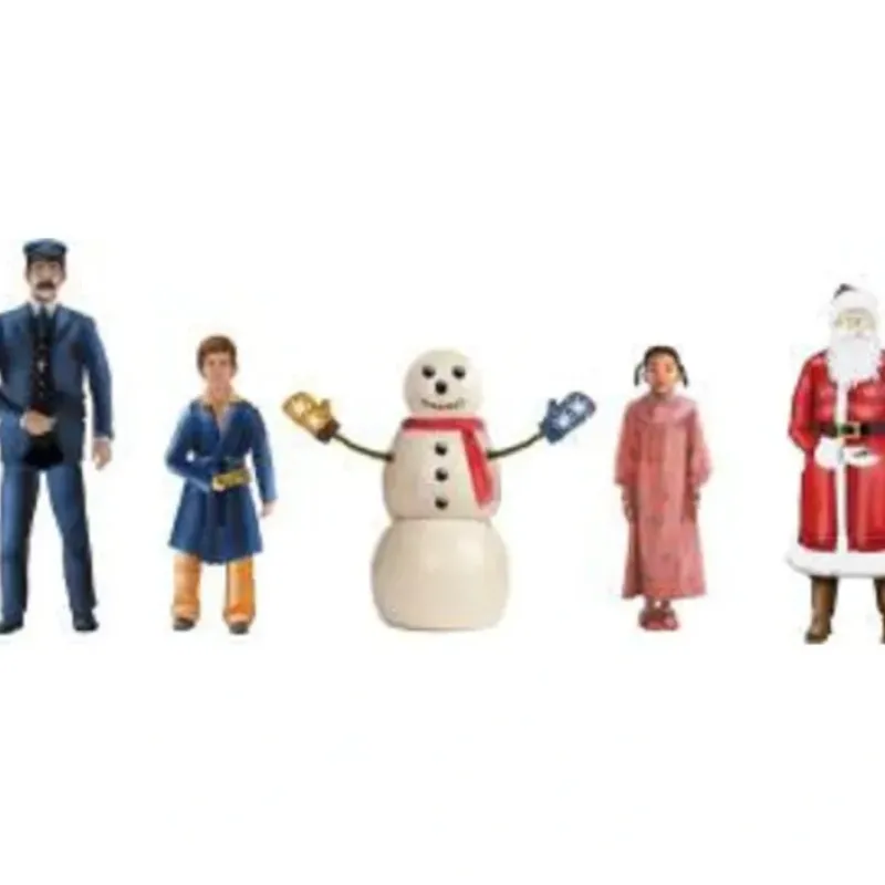 Five pewter figures of classic movie characters including the Conductor, Hero Boy, the Snowman, Hero Girl and Santa Claus