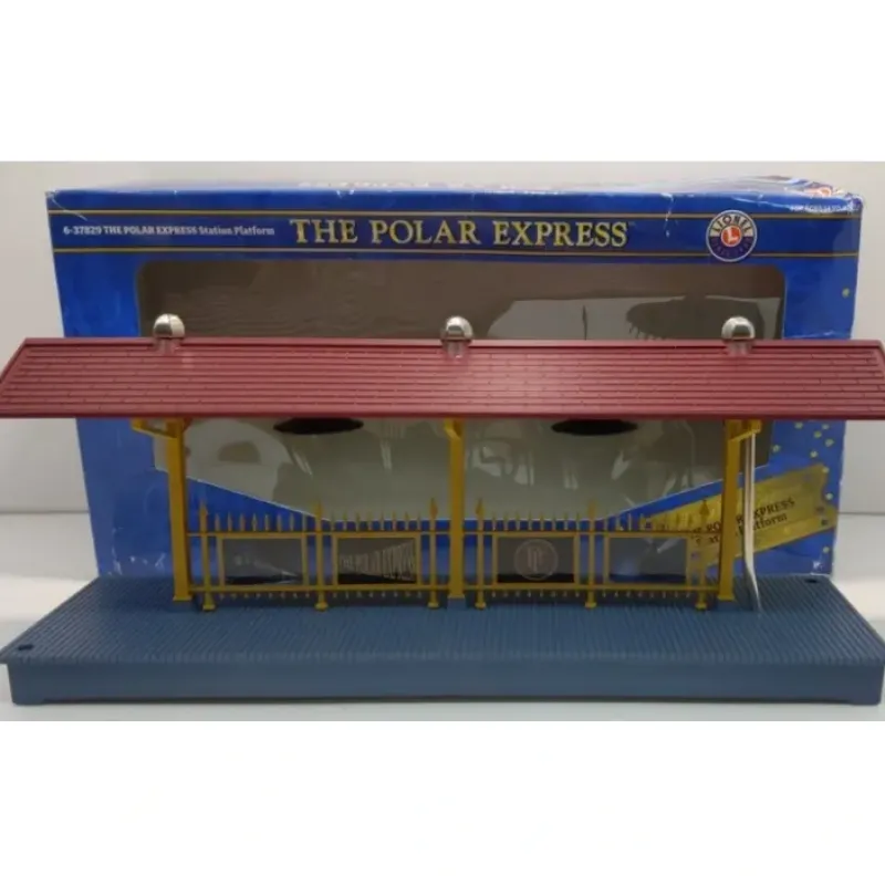 Here is a Lionel 6-37829 Polar Express Station Platform. Its key features are:Polar Express graphics on signs and two lights with shades. Dimensions: 12 x 3 3/8 x 5.