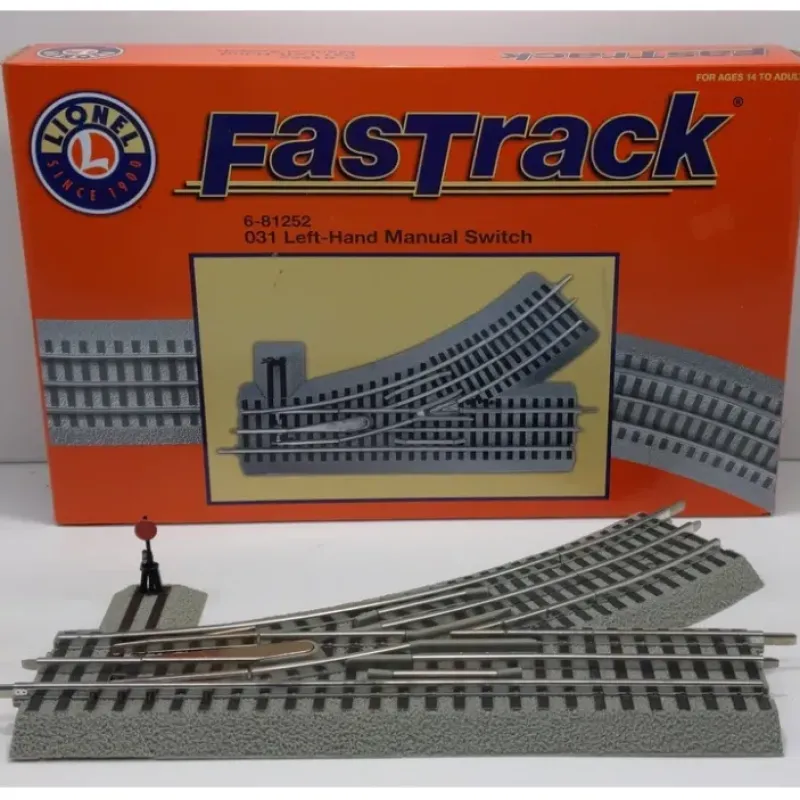 This is a Lionel 6-81252 O FasTrack O31 Manual Left Hand Switch. Features includes 1/4 curve to complete O31 45-Degree curve, flawless non-derailing function allows trains to keep running regardless of switch position, plug and play using track voltage or auxiliary power, realistic illuminated switch lantern. Lantern base is interchangeable, can move to the right or left side.