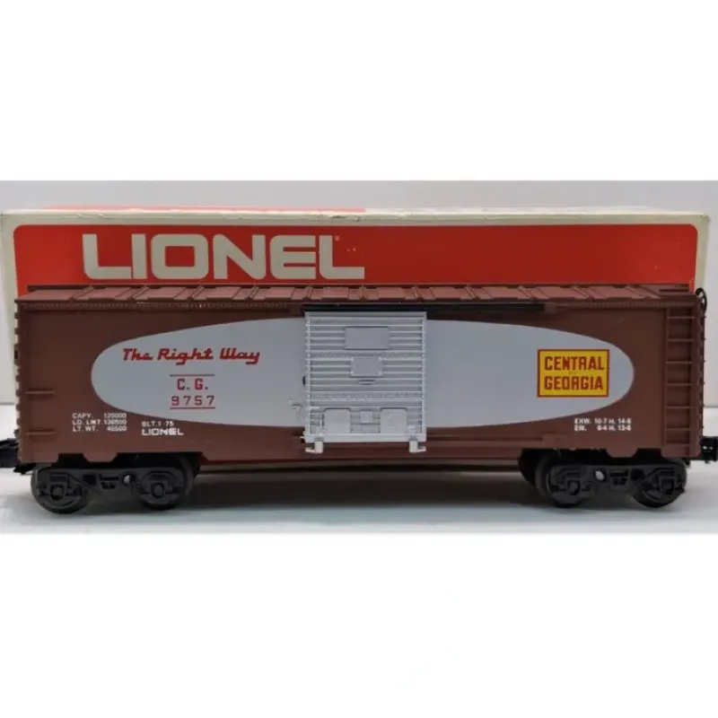 This is Lionel 6-9757 O Gauge Central of Georgia Boxcar from 1974. It has a brake wheel, two sliding doors (that are yellow plastic painted silver), plastic trucks, operating knuckle couplers, and metal wheels and axles. This car was an uncatalogued special.