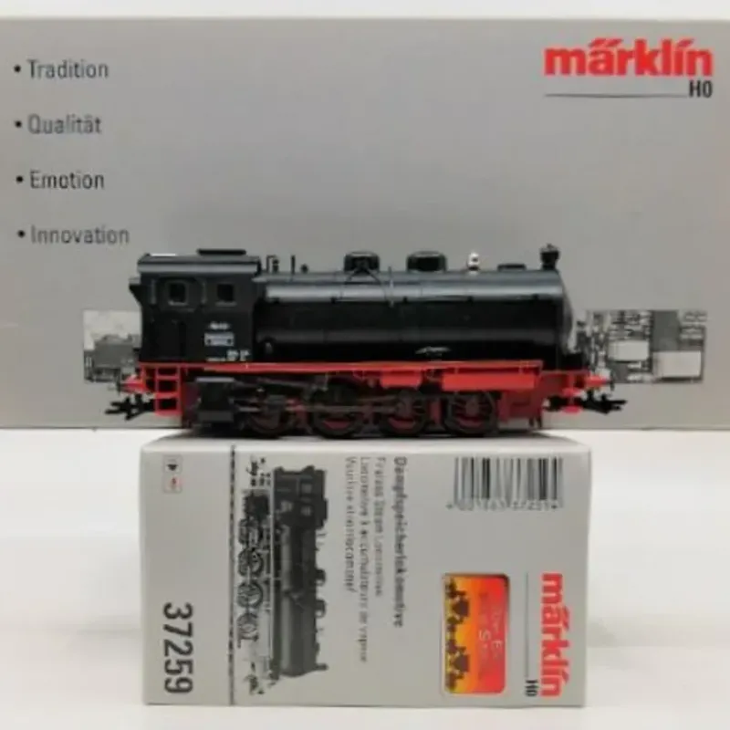This is a Marklin, Inc 441-37259 HO Scale Steam Fireless 0-8-0 Switcher – 3-Rail – Digital & Sound Equipped Era IV Scheme (black, red)