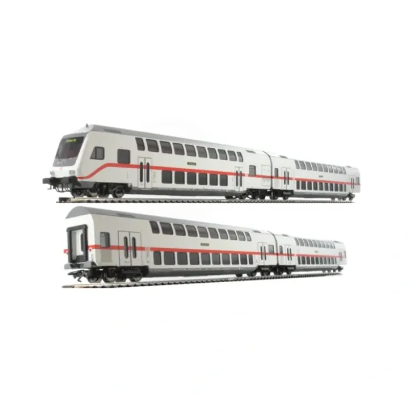 This is a Marklin, Inc 43476 HO Scale IC Bi-Level Car Set. Prototype: German Railroad, Inc. (DB AG) 1 bi-level car, 1st/2nd class, 1 bi-level car, 2nd class, 1 bi-level car, 2nd class with a bicycle compartment, and 1 bi-level cab control car, 2nd class. IC paint scheme. Model: All of the cars have tinted side windows and close couplers. The cab control cars have red marker lights and white headlights that change over with the direction of travel. Total length over the buffers 107.7 cm / 42-3/8.
