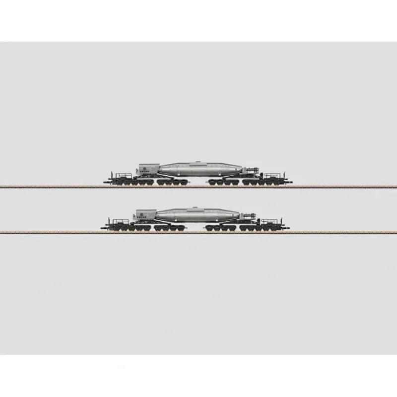 This is a Marklin, Inc 86202 Z Scale Steel Works 18-Axle Hot Metal Torpedo Ladle Car 2-Pack – Ready to Run Krupp (Era III/IV, silver). 18-axle cars lettered for the firm Krupp are used for transporting molten crude iron. Cars have finely executed paint and lettering, 2 main supports constructed of metal and each has a 4-axle and 5-axle truck. The torpedo ladles are self-supporting with a machine unit and a thrust bearing.