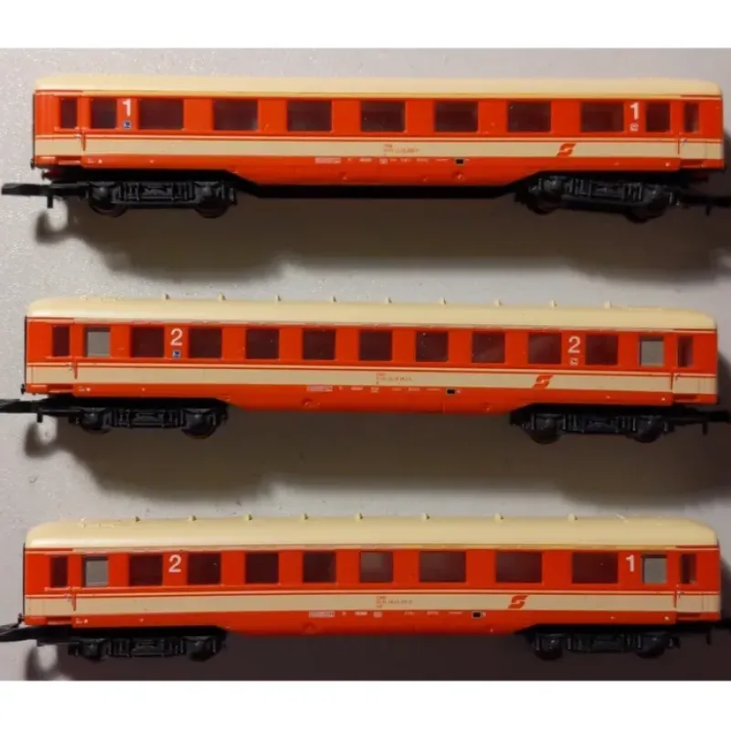 Here is a Marklin 87354 Z Scale OBB Passenger Car Set. Each car features a durable plastic body construction with intricate detailing, metal wheels and axles, and fish-hook style couplers.