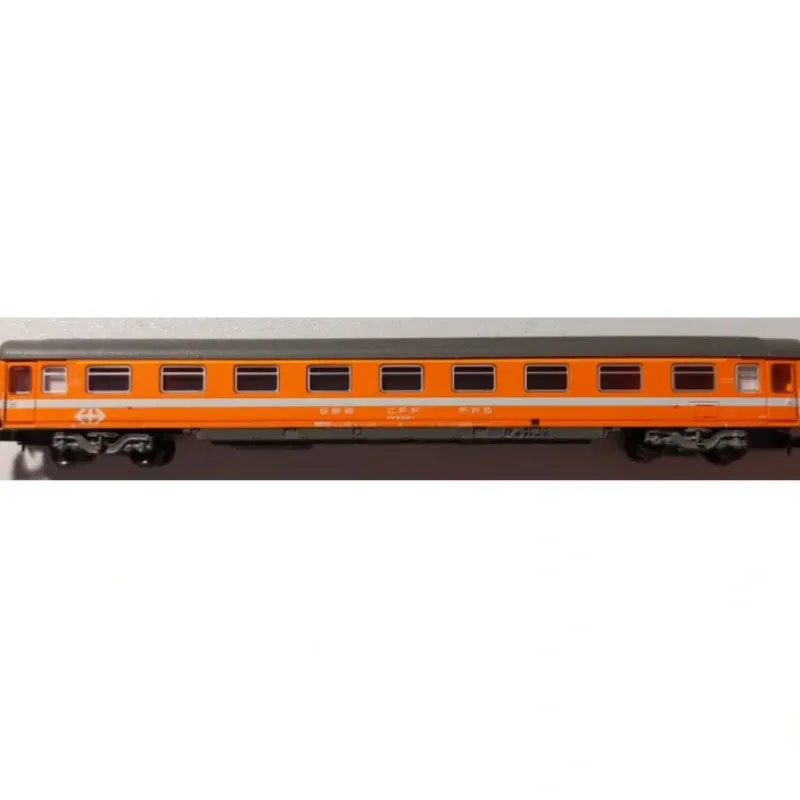Here is a Marklin 8741 Z SBB Swiss Orange 1st Class Eurofima Express Passenger Car. This passenger car features a durable plastic body construction with intricate detailing, metal wheels and axles, and fish-hook style couplers.
