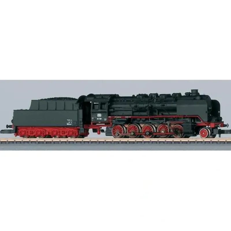 This is a Marklin, Inc 88843 Z Scale Steam Class 50 2-10-0 w/Wagner Smoke Deflectors – Standard DC German Federal Railroad DB (Era III, black, red). The locomotive has a 5-pole Mini-Club motor. All of the driving axles are powered. The locomotive has Wagner smoke deflectors and dual headlights. The pilot truck has solid wheels. The driving wheel has a larger counterweight. The buffer plates have warning stripes. Length over the buffers 109 mm / 4-1/4. Highlights: Dual headlights. Wagner smoke deflectors.