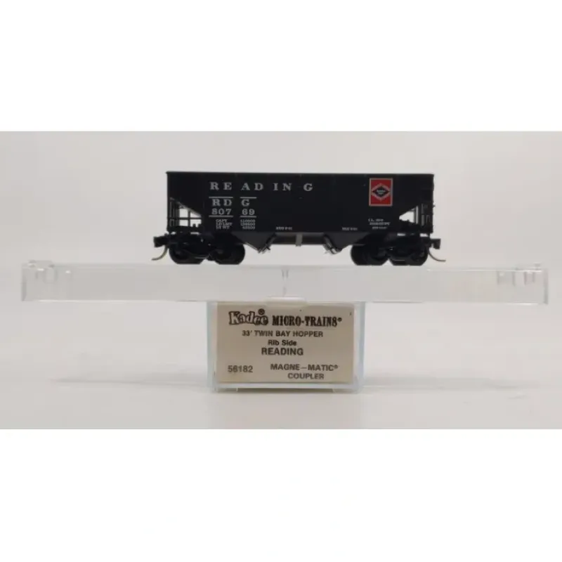 Here is a Micro-Trains 05600182 N Reading 33′ Twin Bay Rib Side Hopper #80769t. These cars feature plastic construction, plastic trucks, magne-matic knuckle couplers, plastic wheels and axles. Please see pictures for included cars.