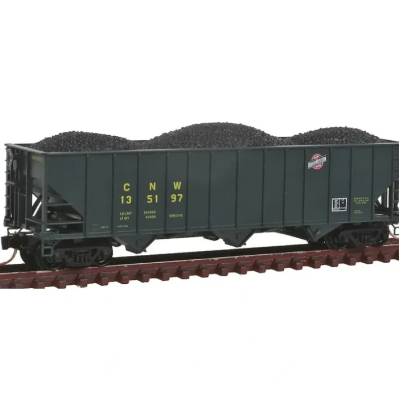 Here is a Micro-Trains 10800250 N CNW 100-Ton 3-Bay Rib Side Open Hopper w/Load #135197. This 100-ton three-bay open hopper is painted green with CNW’s Chicago System Red and Black logo and letting in yellow and white. This car features a plastic construction, plastic trucks, plastic wheels and axles, and knuckle couplers.