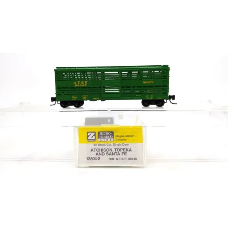Here is a Micro-Trains 13804-2 Z Scale A.T.S.F. 40′ Despatch Stock Car #68845. This car features a plastic body construction.