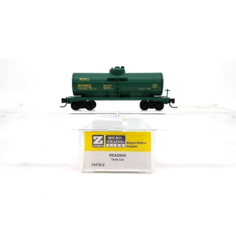 Here is a Micro-Trains 14416-2 Z Scale Reading Tank Car #90983. This car features plastic construction, plastic wheels and axles, and knuckle couplers.