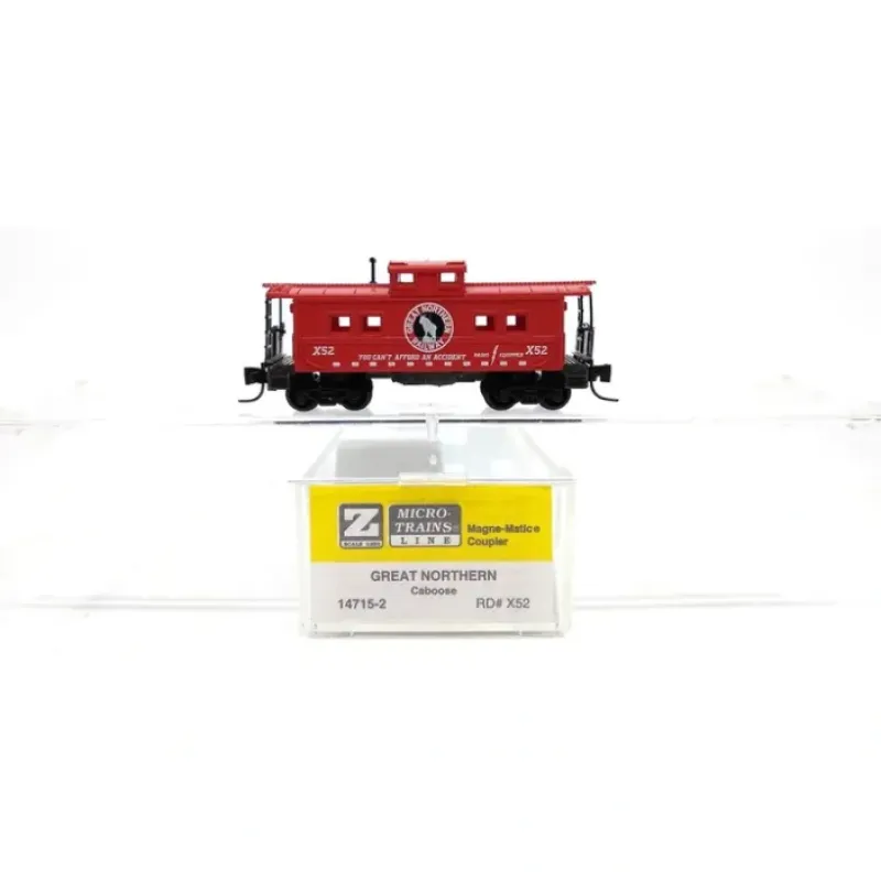 Here is a Micro-Trains 14715-2 Z Scale Great Northern Caboose #X52. These cars feature plastic construction, plastic trucks, knuckle couplers, and plastic wheels and axles.