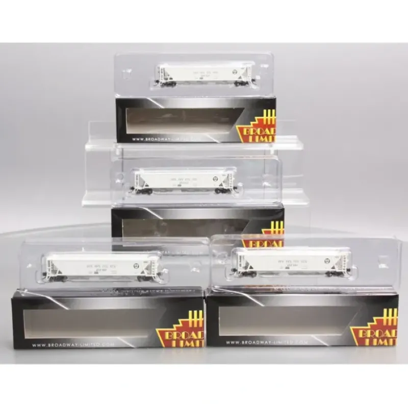 This is a Broadway Limited 3170 N Scale Pennsylvania Railroad PRR Class H32 5-Bay Covered Hopper 4-Pack – Ready to Run Set A (gray, black, Circle Keystone). Industry-Leading Features: Beautifully Detailed and Accurately Modeled, Precision Paint, Color, and Lettering Schemes, Many Separately Applied Details, Composition: ABS, Couplers: (2) Operating MicroTrains #1015 or Compatible, Compatible Tracks: Code 55, 70, 83, & 100 Rail, Minimum Operating Radius: 9.75 in.