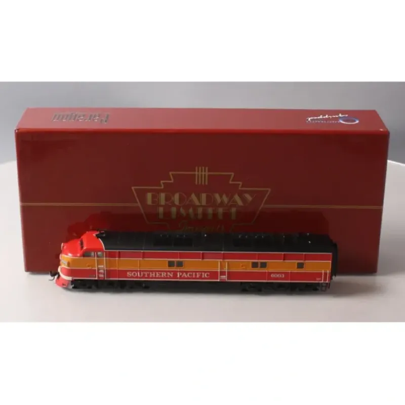 Here is a Broadway Limited 612 HO Scale Southern Pacific EMD E7A Diesel Locomotive #6003 Paragon Series With QSI Quantum Sound. The E7 was the diesel most railroads choose to lead their New post-war streamliners. Introduced in 1945, it retained the square windows and air intakes found on earlier models, but an additional grille behind the cab and the bulldog nose (introduced on F units) gave it a unique appearance. The E7 proved to be the best-seller of the series, with 428 built through 1949. From the correct bulldog nose to the full cab interior to the authentic paint and lettering, these models will be a welcome addition to your HO streamliner fleet. It is made out of plastic construction, has plastic trucks and knuckle couplers. Each is detailed to match its as-built appearance, and will include the correct style of numberboards as used by its prototype. Constant intensity directional lighting and a powerful can motor are standard equipment too.
