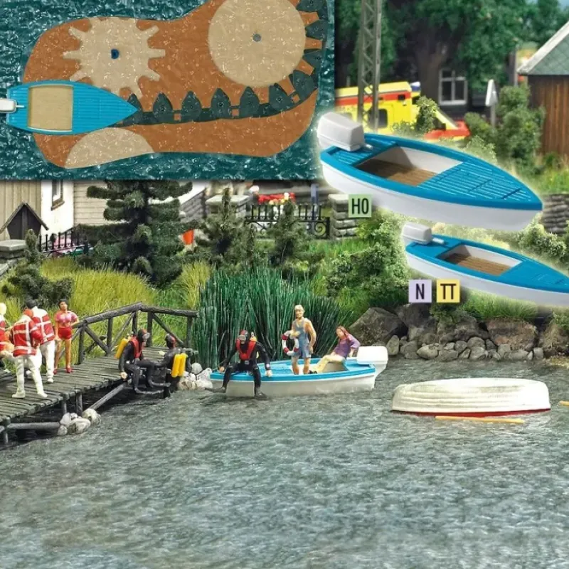 This is Busch 5480 Lake with Boat. With electric powered boat. Size appr. 26cm x 18 cm. Add action to your layout with this motorized scene. the kit includes a 14-16V motor, drive chain, drive box, lake foil, boat and complete instructions.