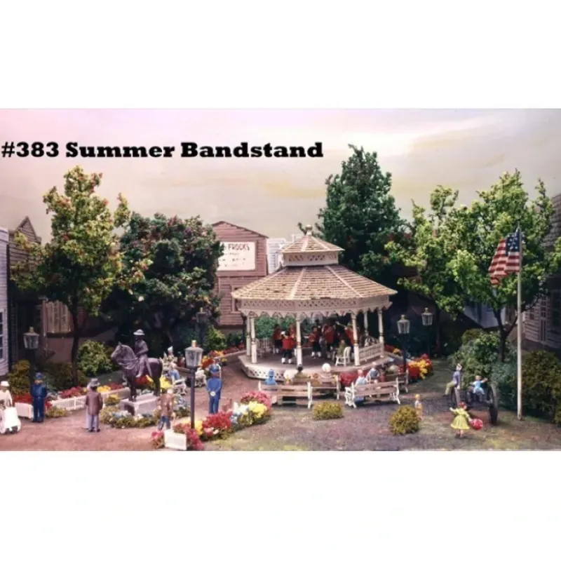This is a Campbell 383 HO Summer Bandstand. This craftsman kit consists of scale lumber (sugar pine), printed card stock, all fretwork, and Campbell’s famous realistic shingles. It is ready for paint and weatherizing. Complete instructions, drawings, and templates are included.